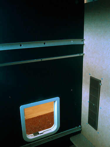 Medir cuidadosamente, donde va el drawerslider en el interior de la MALM. Vuelva a colocar la plantilla de catdoor alrededor de 2 o 3 cm en la parte superior. Como esto no es mucho para el gato entrar, y el recorte del cajón se puede hacer fácilmente. Cortar con la sierra caladora y después montar la puerta según las instrucciones, pero sacar la parte que hace pivotar o por lo menos Asegúrese de colocarlo en su posición de bloqueo.