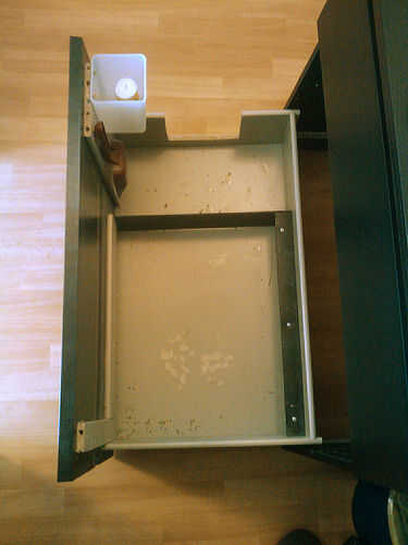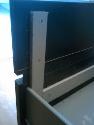 A continuación tome la izquierda partes desde el tercer cajón. Usé los lados para fijar el medio frente al cajón inferior. Uno de ellos corta por la mitad longitudinalmente para usar como una especie de relleno que mejor ajuste el buzón en el cajón. La brecha entre el frontparts cubrí con una banda de PVC negro, fijada en su lugar con cinta de doble cara.