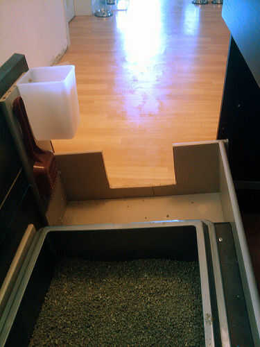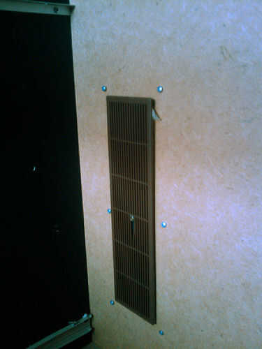 Utilice el carpetknive para cortar un agujero en la pared posterior, para ajuste en la rejilla de entrada de aire. Monte la parrilla y el filtro (jodido tres pedazos de hoja de PVC en el exterior de la pared para contrarrestar la parrilla e intercala la incertidumbre estera del filtro)