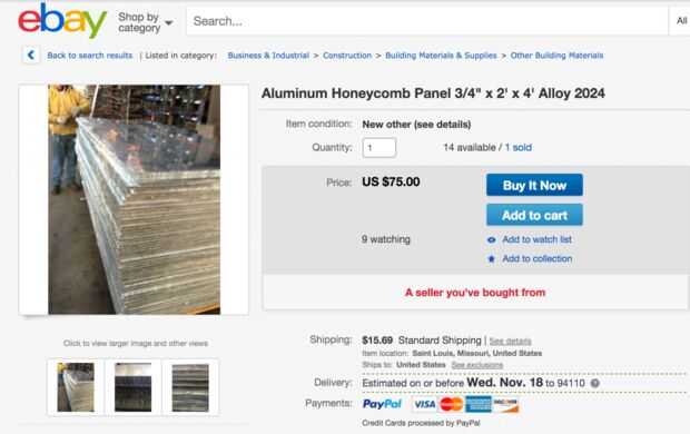 El material que decidí usar es un 3/4" panel de aluminio. He encontrado hojas de 4' x 2' en eBay por $50 con envío gratuito, aunque los precios pueden variar según lo indicado por la imagen.