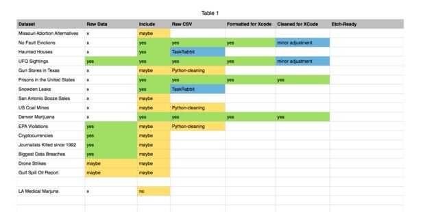 Rastreado a través de datos en GitHub repos, sitios web de gobierno, a través de conexiones personales y más. Algunos de los "malos datos" parecían demasiado localizadas (como San Antonion alcohol ventas), mientras que otros parecen tener más sentido como las ubicaciones de todas las prisiones de Estados Unidos en el mundo.