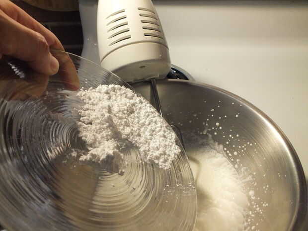Tanto como con los ingredientes secos en el pudín, quieres añadir lentamente el azúcar en polvo, dándole tiempo para mezclar con la crema.