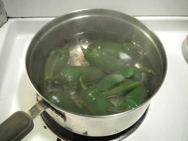 Parboil los pimientos cortados en agua hirviendo durante unos 3 minutos, hasta que ablande un poco. Retire y coloque en un recipiente de agua con hielo inmediatamente.