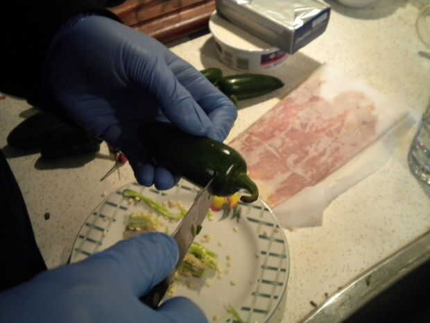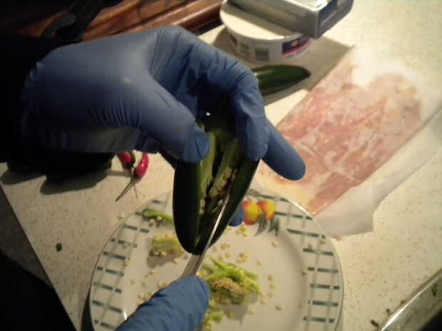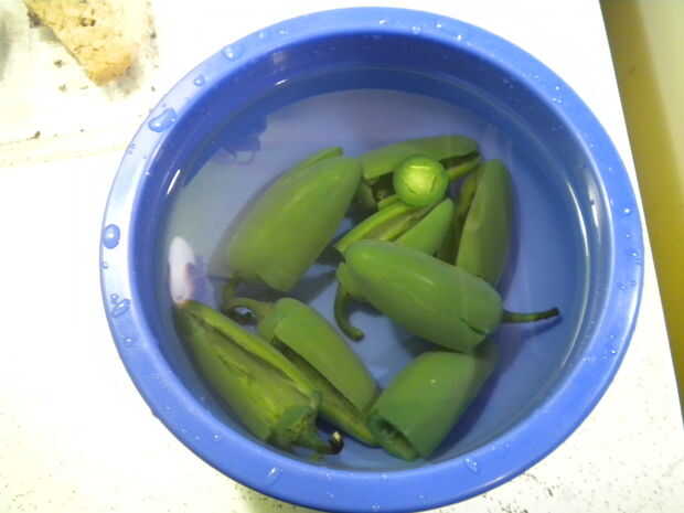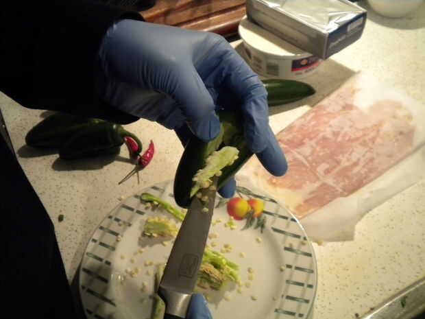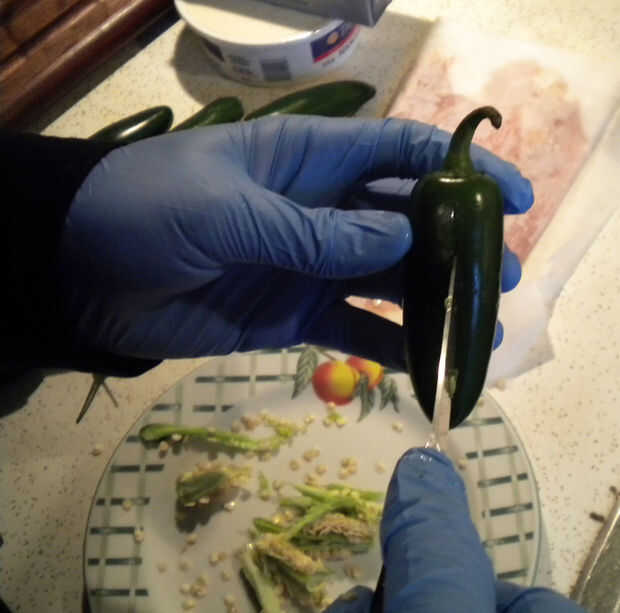 Corte el jalapeño del tallo hasta la punta, cortando sólo la primera capa de la pimienta (Foto 1).