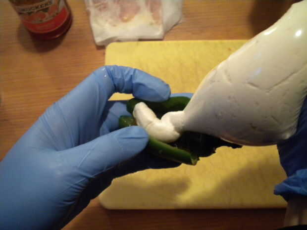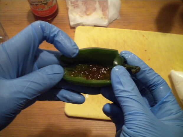 A continuación, tomar uno de los jalapeños secos y sacar un poco de la gelatina en la parte inferior. Llene el área restante con el relleno de queso, pero asegurarse de que todavía puede cerrar la pimienta en su forma original. Su mejor para ser más relleno. Puede forzar la pimienta para cerrar y limpie cualquier exceso queso que rezuma hacia fuera como lo haces.