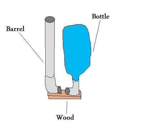 Tome el 6½ pulgadas x 1½ pulgadas pedazo de madera.  Puso el cañón en el lado izquierdo de la misma manera que el codo quede a la derecha.  Luego puso la botella de soda en la derecha de la madera para que la pieza de codo quede mirando hacia la izquierda.