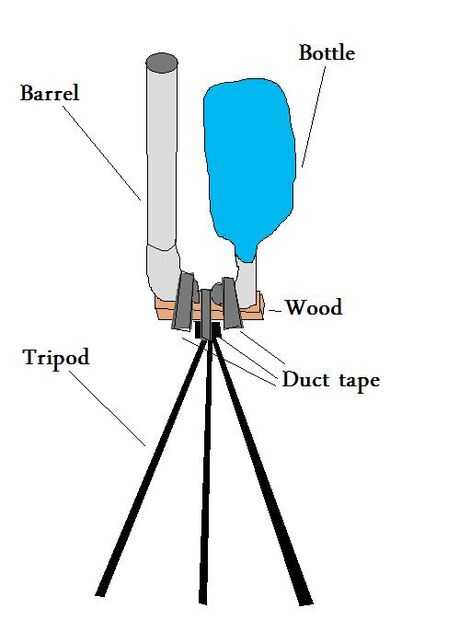 Tomar el trípode y abrirse por lo que es en una buena altura.  Cinta adhesiva el trozo de madera que tiene la botella barril y soda en la parte superior del trípode.