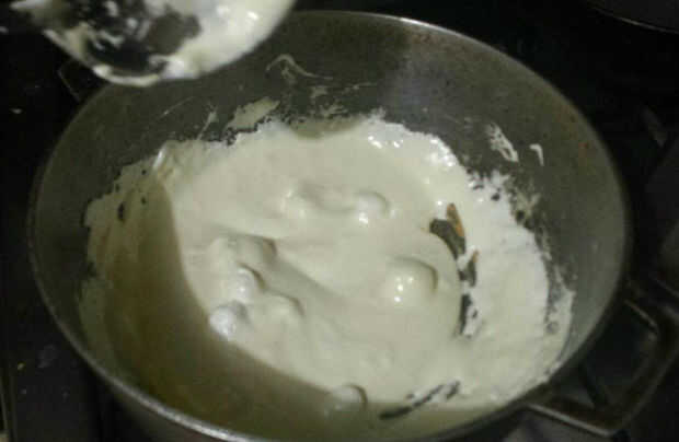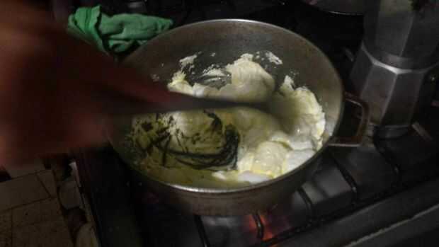Con el cucharon, se mezclan los malvaviscos y la margarina o mantequilla hasta formar una pasta como se ve en la segunda imagen.