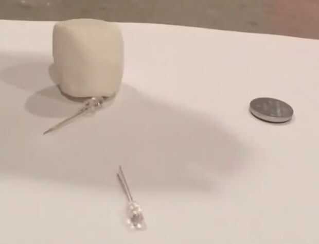 Nota: Si no estás familiarizado con el LED, la pata larga de los LEDs va a tocar el lado positivo de la batería. Probar ahora, antes de llegar a sus manos cubiertas de marshmallow pegajoso.