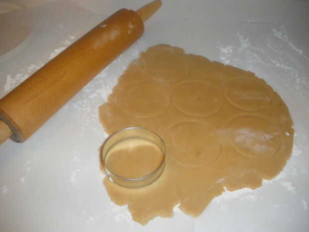 Precalentar el horno a 350o f el. Trabajar con la mitad de la masa en un tiempo y estirar sobre una superficie ligeramente enharinada. Enrolle la masa a unos 1/8" de espesor y utilice el cortador de galletas para cortar redondos. Coloque las galletas en una hoja de galleta alineada pergamino. Enfriar las galletas en el refrigerador durante 10 minutos.