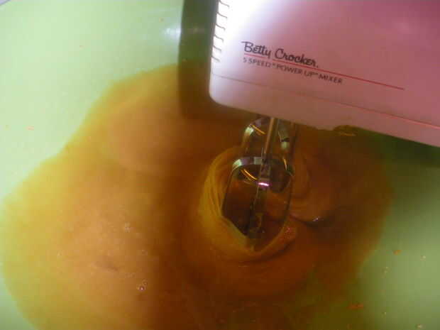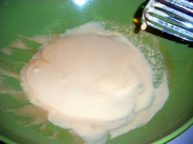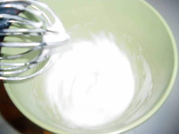 Unos 3-4 minutos, bata las claras en un recipiente aparte hasta que formen picos. Use su batidora de mano y una vez que han formado formen picos, agregar el huevo y la vainilla a la mezcla azúcar/gelatina. Batir hasta sólo combinar.