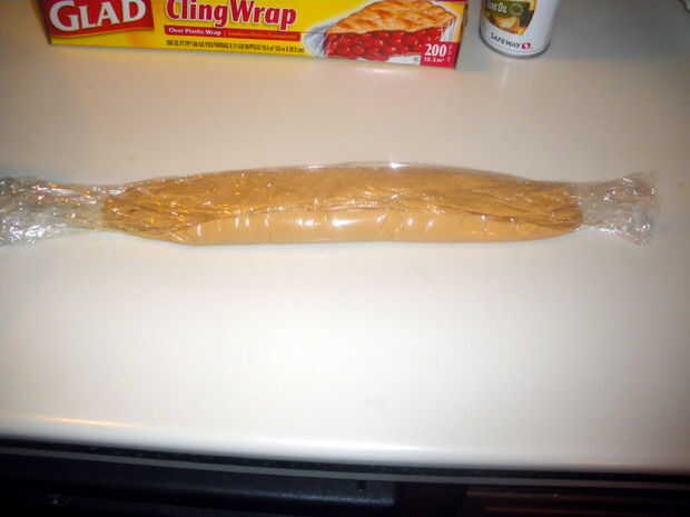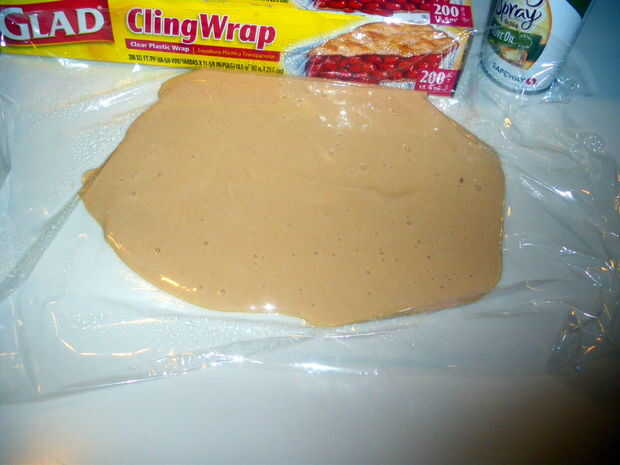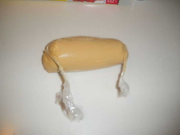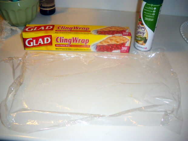 Trabajando rápidamente, colocar una hoja de envoltura de plástico y rociar con aerosol de cocina antiadherente. Vierta la mezcla en la envoltura de plástico y rodillo. Podría tomar unas hojas de plástico para asegurarse de que está cubierto el malvavisco. Gire el envoltorio plástico e introducir en una manga pastelera con un grande, punta redonda. Cortar el la envoltura de plástico sobrante.
