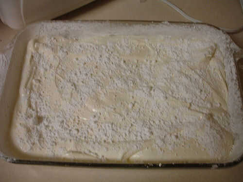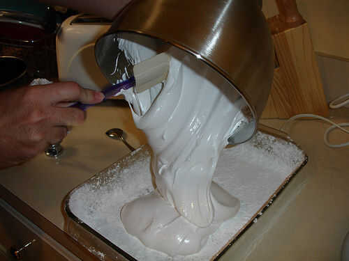 Rocíe a su espátula con la cocina. Ahora Vierta y raspar sus malvaviscos en su plato cubierto de polvo. Trate de empujar la mezcla en todas las esquinas del plato y luego aplanar las melcochas. No tienes que ser muy exactos, parte de la belleza de malvaviscos caseros es que no todos son lo mismo.