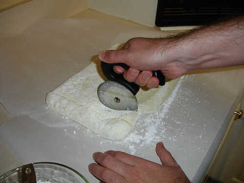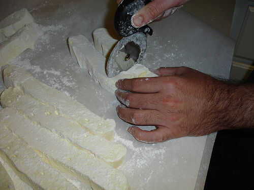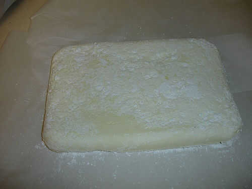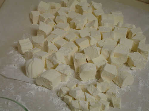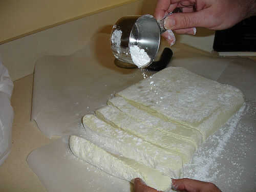 Utilizando el cortador de la pizza, corte tiras de una pulgada de ancho a lo ancho de las melcochas. Con más de la mezcla de polvo para evitar que se pegue el polvo los bordes cortados. Después de cortar tiras largas, cortar las tiras en pulgadas de ancho. Rollo de éstos alrededor del azúcar en polvo y desprender cualquier exceso.