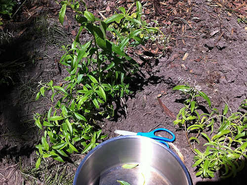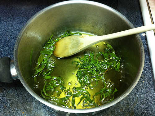 Llevar a fuego lento, revolviendo a menudo para asegurarse de que las hojas están sumergidas y el azúcar se disuelva. Después de unos minutos, apagar el fuego y dejar que las hierbas a infusionar durante al menos 30 minutos. Si lo desea, vierta en un recipiente y refrigere durante la noche.