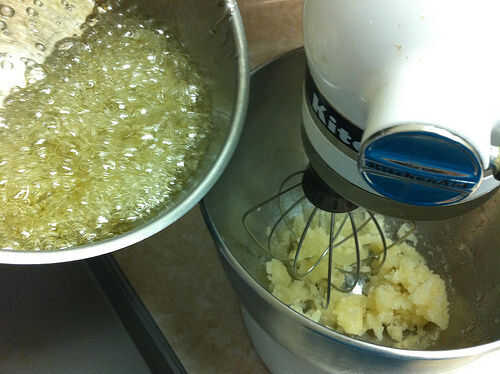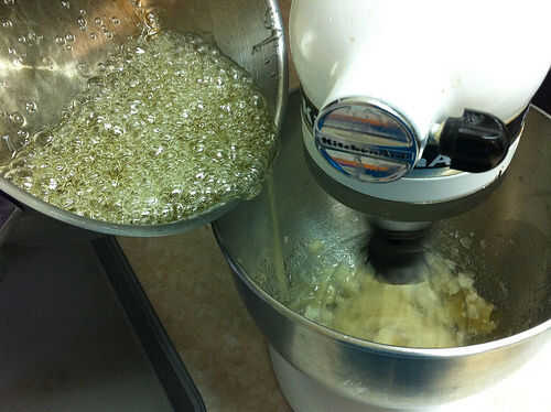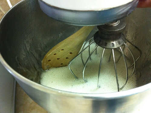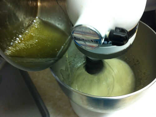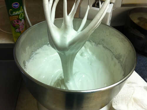 Lentamente, con cuidado, vierta un chorro fino de jarabe caliente en el tazón de la batidora con el funcionando. Ten cuidado. Si se vierte directamente en la boca, a fling jarabe caliente a ti - no es bueno. Si usted vierte demasiado hacia los lados del tazón de fuente, puede enfriar y endurecer allí.