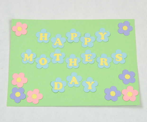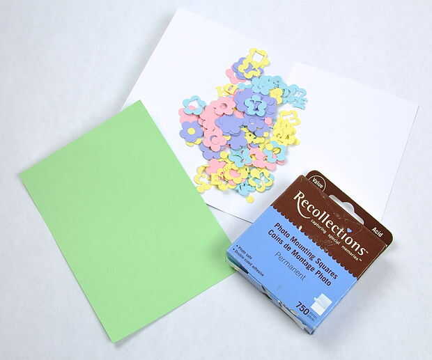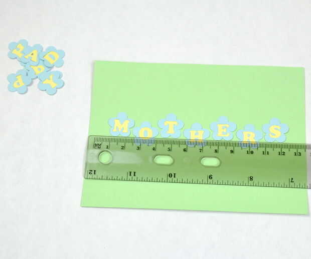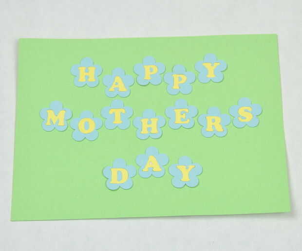 A continuación pegar en las flores. Utilicé las flores con los agujeros en el centro y poner en puntos amarillos. Desde la parte superior de la tarjeta era más concurrida, sólo pongo una flor en cada uno de esos rincones.