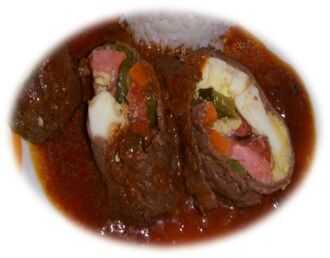 en una rica base de tomate de la salsa... plato que consiste en una rebanada fina de carne, que es enrollado alrededor de un relleno y cocinado, guisado o a la plancha...