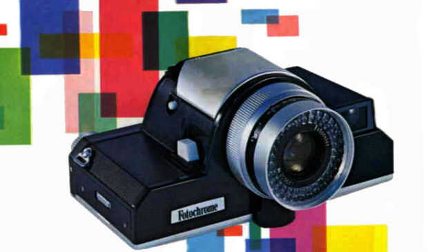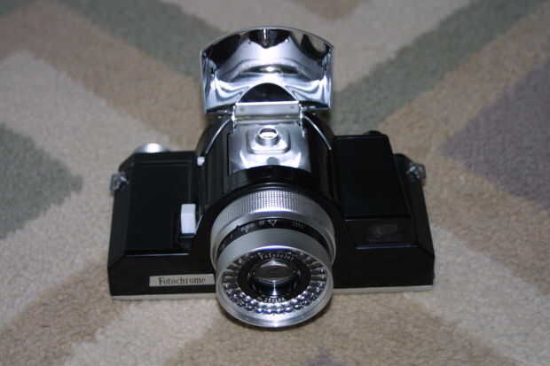 Hay un montón de cámaras funky en el mundo, pero no consiguen mucho funky que la "cámara de Fotochrome Amazing!" Esta abominación fue construida en 1965 específicamente para utilizar material impreso de Ansco color directo positivo. Supongo que no fue una idea horrible... cortar el negativo y reducir los costos. Se cortar los costes, pero el mayor problema con este modelo de negocio; Polaroid había estado haciendo directo positivo durante años y casi al instante (todavía tenía que enviar el material de Fotochrome para procesamiento especial). Parecía una Polaroid y costo menos, pero no se que calidad americanos amor... gratificación instantánea. Otros problemas: muy lenta película ISO (10), célula de selenio responde lentamente, y la calidad de construcción era muy cutre.