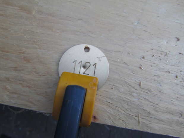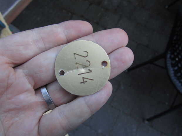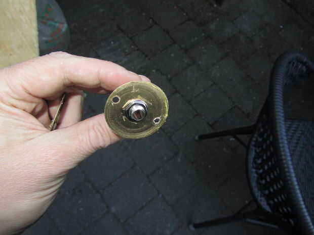 En este punto, hemos utilizado el serrucho para cortar un agujero de 1 1/8". Encontrar una pieza de metal lo suficientemente grande como para perforar y montar sobre el agujero. Tuve estas cosillas número de latón.