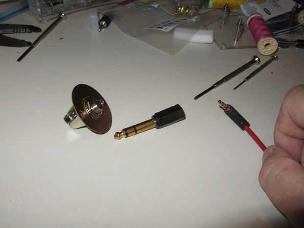Puesto que sólo tenía 1/8" auriculares para probar, he utilizado una 1/8" a 1/4" adaptador. La imagen de mí en la camisa de estilo CBC es me prueba el adaptador para asegurarse de que funciona.