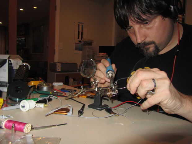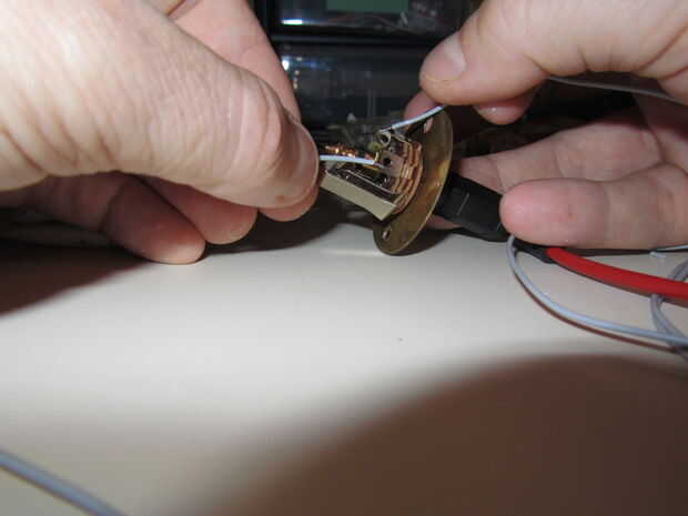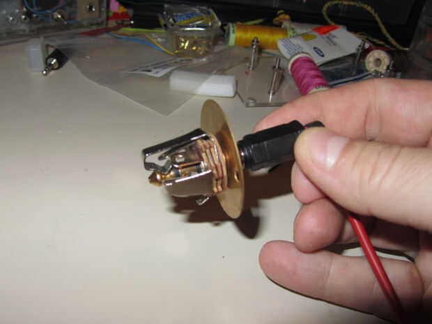 Una vez se sueldan ambos los conectores de audio, el cable de alimentación a través del orificio del conector de audio en el cuadro de controlador y atornille el conector de audio. Prueba nuevamente una vez que se adjunta.