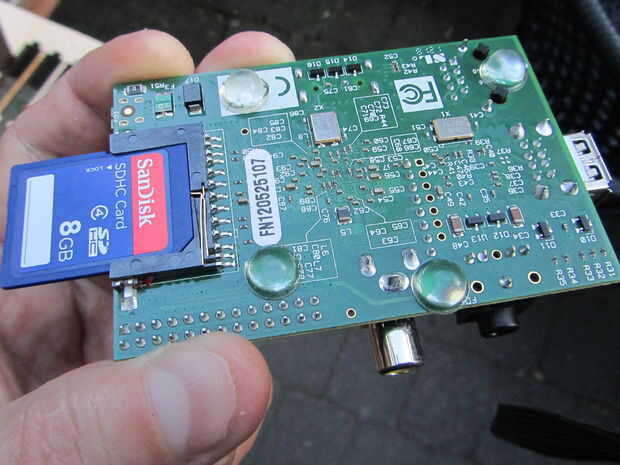 En primer lugar, conseguir algunos de esos pequeños pies pegajosos redondeos y sujete a la parte inferior de la RPi. Esto le dará suficiente espacio para sacar la tarjeta SD.
