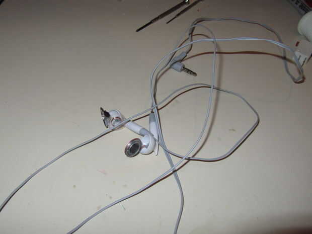 Vas a necesitar dos viejos conjuntos de auriculares con extremos de miniconector de 1/8". Cortar las almohadillas y los cables detrás de la tira. Luego conecte sus auriculares buenos en la toma de audio. Enchufe el cable de auricular modificado en una fuente de audio.