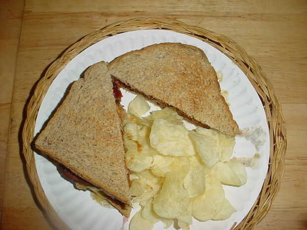 No tienes que cortar el sándwich por la mitad, que es una preferencia personal, fritas, al horno ensalada de frijoles, patatas o macarrones haría lados bonitos pero fui con chips... Añadir su bebida de elección y disfrutar