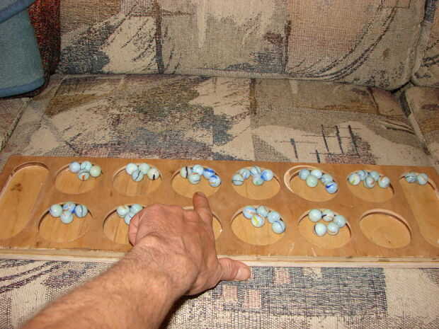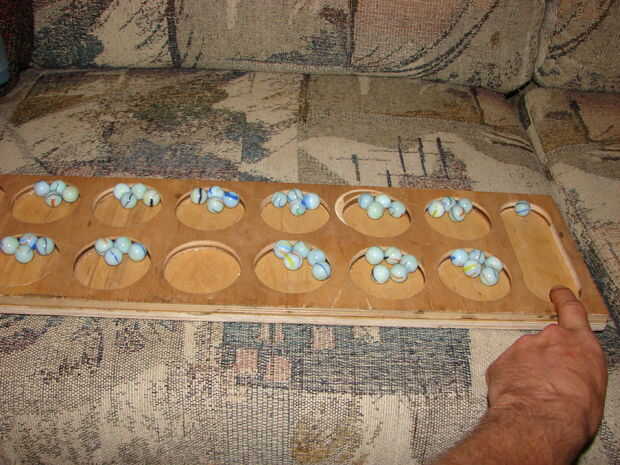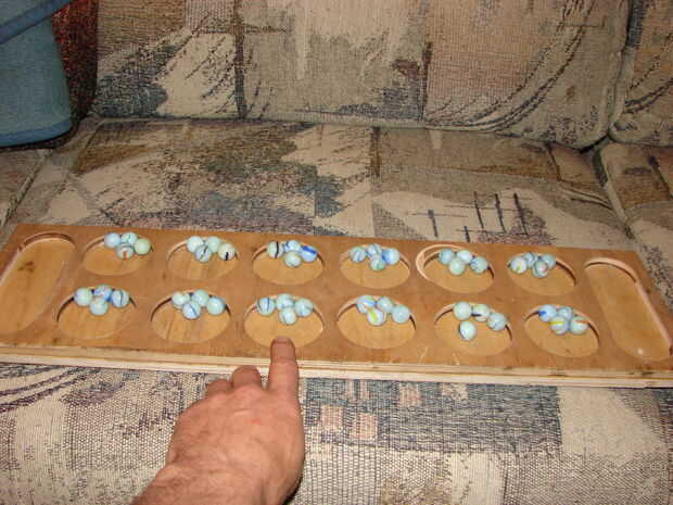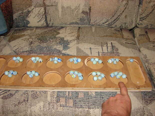 En la primera foto, mi dedo índice indica la primera ranura de que elegir jugar. Recoger todos los pedazos de esa ranura y colocarlas una a la vez, hacia la izquierda alrededor de la Junta. Porque la última piedra aterrizó en mi tienda (ranura derecha) que puedo mover otra vez. Usando esta estrategia puede permitir múltiples movimientos por girar a medida que avanza el juego (nota que el número de piezas por ranura cambia continuamente a lo largo del juego). Para mi próximo paso seleccionar la ranura más cercana a mi tienda. Cuento las piezas hasta que estén todos, terminando en el lado del oponente del tablero. Esto termina mi turno.