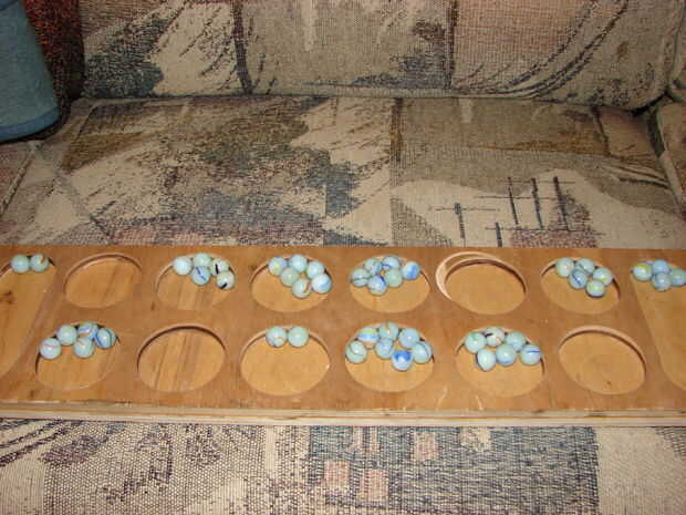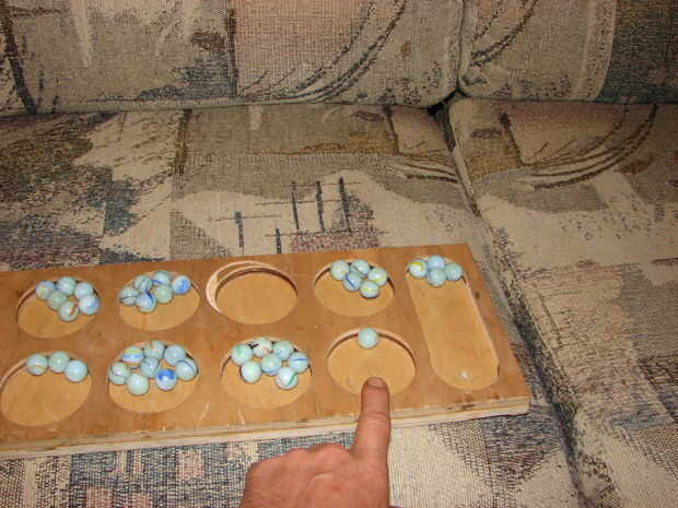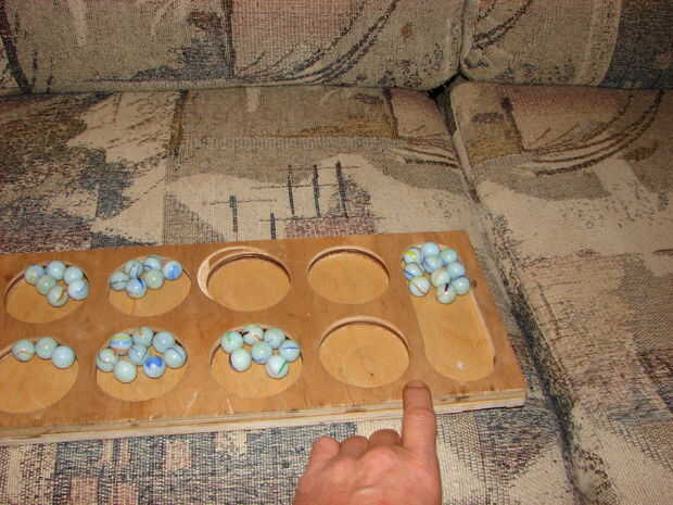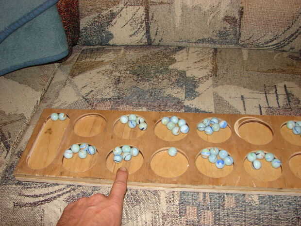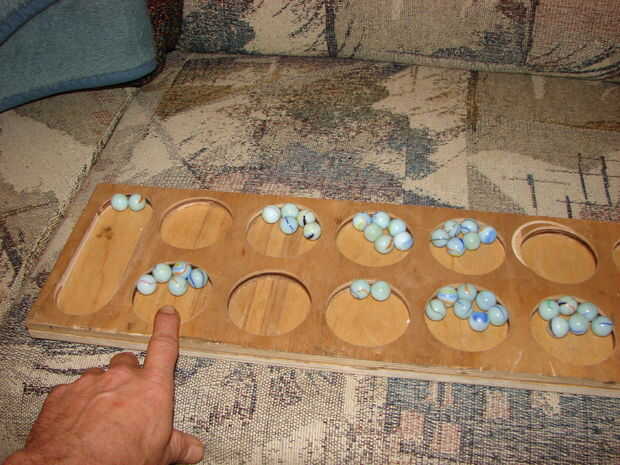 Ahora es el momento de explicar el aspecto de la captura del juego. Tenga en cuenta que la ranura más cercana a mi tienda está vacía y la ranura 6 de 5 piezas. Si durante el juego, su última pieza termina como la única pieza en una ranura en el lado de la Junta, capturar todas las piezas de ranura opuesta de tu oponente. Piezas de tu oponente en esta ranura, así como su pieza única de su lado del tablero se coloca en su tienda. Esto termina mi turno.