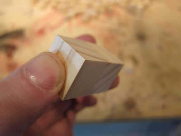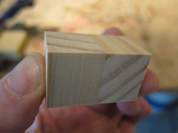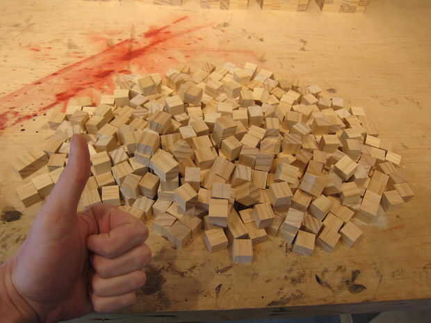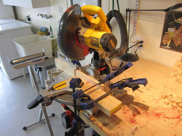 Ahora usted tiene un montón de tablas que son todos idénticos. Siguiente paso es usar la tronzadora para cortar los tableros en píxeles cuadrados. ¡ Es fácil! Yo uso un 2 x 4 y abrazaderas para una parada en mi chop vieron, entonces yo cortar las piezas de prueba. Si usted puede tomar dos pixeles, uno gire 90 grados por lo que es de grano encajen y no sentir ninguna diferencia son bueno para ir! Así que empieza a cortar. Corto 4 tarjetas en un tiempo y comprobar la longitud de los píxeles cada pocos cortes.