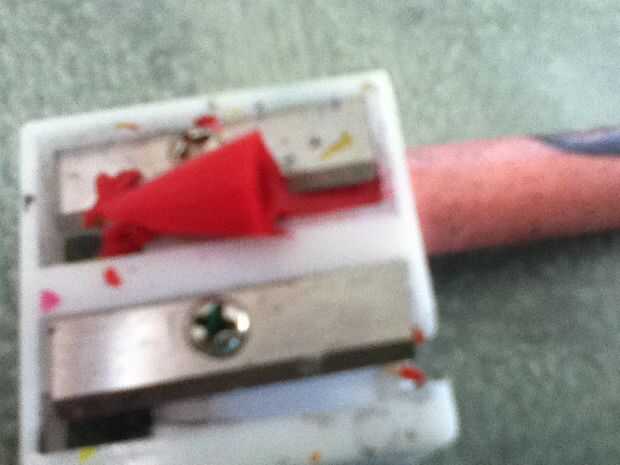 Sacapuntas de lápiz de uso para afilar lápices de colores. Permitir que las virutas de caer en una mitad del papel de cera.