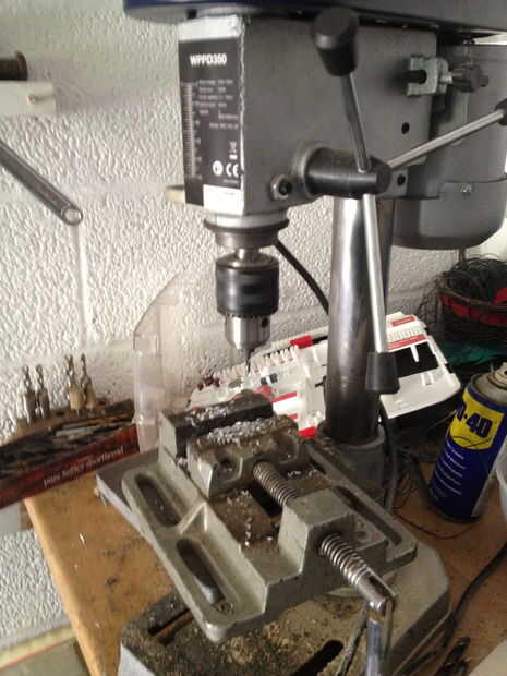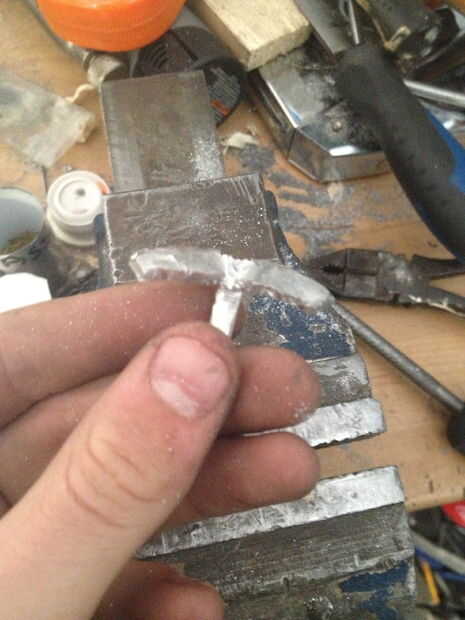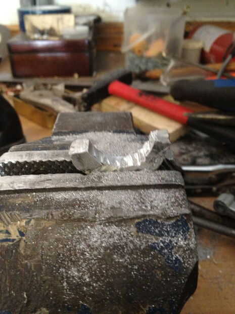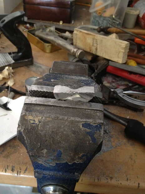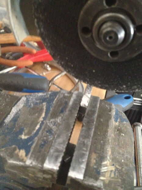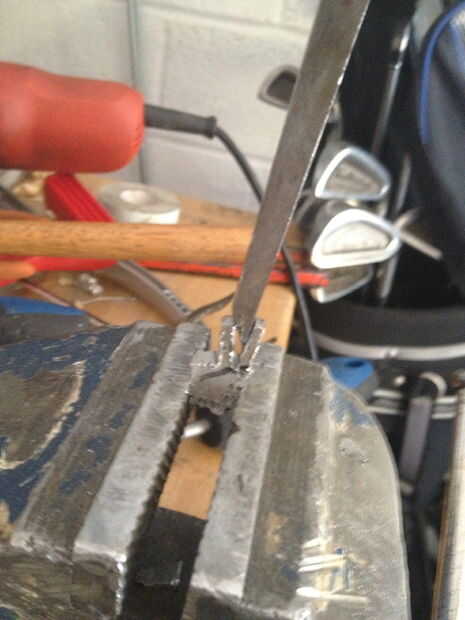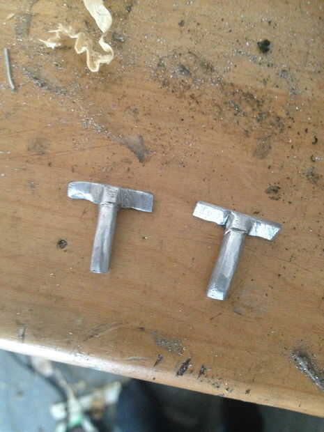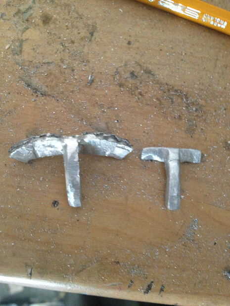 primero, tome un pedazo grueso de 10mm de barra de 40mm alumiunium ancho, luego cortarlo por la mitad, así que tiene dos semicírculos, luego utiliza su taladro y poner sobre una broca en el mandril de 2 mm, luego perforar una línea de agujeros siguiendo el borde de la semi círculo, de unos 10 mm desde el borde, luego chisle y el pequeño semicírculo de martillo , usted debe dejarse con una curva cuadrada, entonces el archivo al interior de la curva lisa, entonces empezar a limar, un lado de la curva, por lo que usted tiene alrededor de 20 mm de área presentada abajo, tienes que presentar esta zona hasta unos 4, 5 mm cuadrado, sin embargo por ahora presentar a alrededor de 5.5 mm, usted debe dejarse con un trozo más grueso en el otro extremo , poner todo en una pinza y cortar una vertical por la mitad de la raja. Luego use un formón para comenzar a doblar a ambos lados, luego empezar a martillo las piezas planas, hacerlo muy cuidada, para que no rompa el aluminio, entonces tendrá una curva T-shape.In las fotos se me olvido tomar foto de la fase de corte, así que intenté Mostrar con un pedazo de chatarra. Archivo luego abajo de cada brazo de la T para comenzar a alrededor de 6mm a cada lado, luego al archivo más lejos, a 4mm, y que se vea delicado y prolijo, seguí comparando a las tripas de la mancuerna, para obtener el tamaño adecuado, cuando es limpio, presentar un aproximadamente 25 grados de ángulo sobre el tallo, luego arena, pidió prestado algunos archivos muy pequeños de la escuela , a Sobrehilar para arriba.