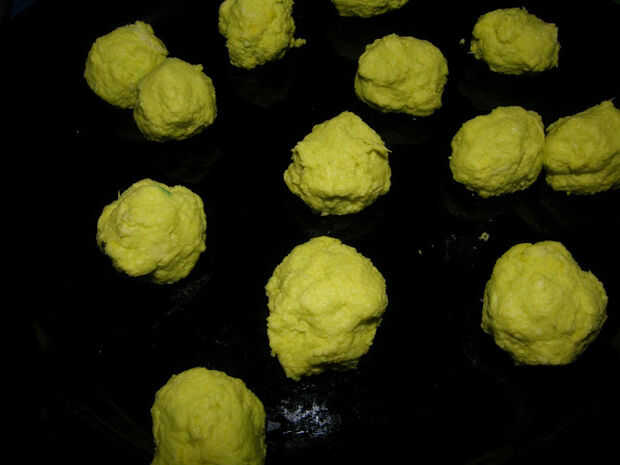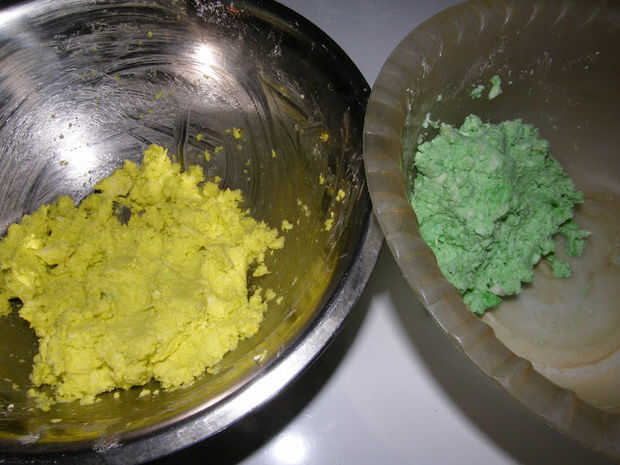 Yuca rallada se dividen en dos partes iguales y añadir el amarillo a una porción y verde del colorante del alimento a la otra parte. Formar bolitas.