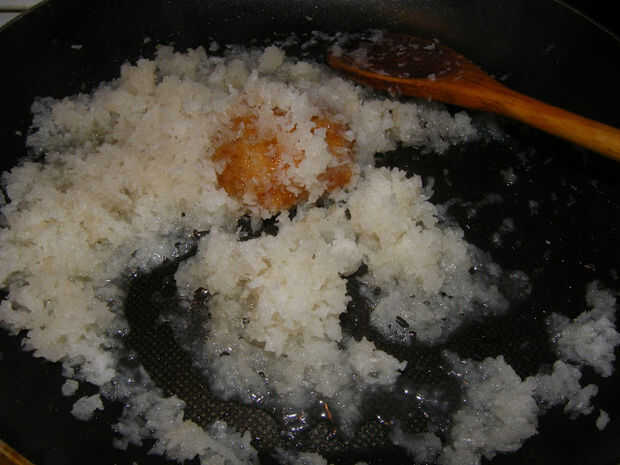 La mezcla de coco, agua, azúcar de Palma, azúcar en una olla, a fuego lento hasta que el azúcar disuelto y espesamiento de la mezcla. Forma en 8 bolas, apartar y enfriar a temperatura ambiente