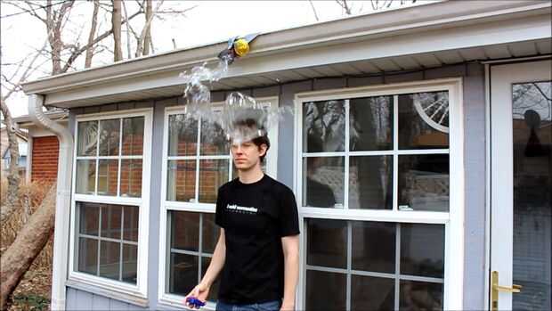 Funciona esta broma. Un globo se esconde fuera de vista. Puede ser llenado con agua o simplemente aire. Inmediatamente al lado del balón, se coloca la rueda de un coche de control remoto. Entonces coloque una aguja a la rueda. Cuando la rueda gira, la aguja extiende el globo. Esto ni asustar a la persona o remójelos en agua.