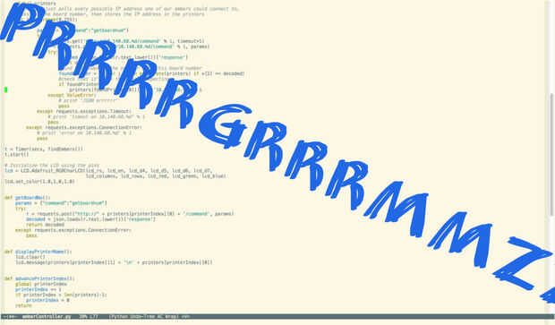 Aquí hay un buen tutorial en botones de Adafruit https://learn.adafruit.com/connecting-a-push-button-to-beaglebone-black/overview usando este tutorial y la pantalla LCD podrá conseguir más la materia periférica sin embargo le gustaría. Os adjunto el archivo que hice. Cada mañana se debe actualizar la lista de impresoras y que estén en la misma dirección que antes. Si no desea que esta característica sólo puede comentar la sección de código usando el temporizador y la función findEmbers(). He utilizado la API de red Local de Ember para obtener la información de impresora usted puede leer más sobre él aquí https://github.com/spark3dp/ember-firmware/tree/master/docs armadas con todo este conocimiento hizo dos de los botones seleccionar cual impresora es hablar y mostrar en la pantalla LCD. Los otros dos envían falso botón presiona a la brasa sobre un ssh túnel (Nota Esto no es a través de la API de red Local).