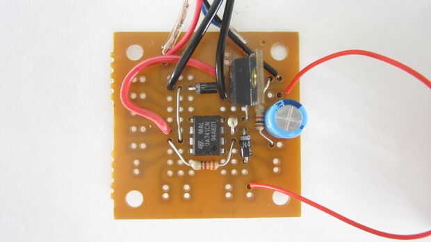 Al montar el circuito, primer prototipo en un protoboard. Para probar el funcionamiento del circuito, conecté un LED a la salida. Una vez que estaba contento con el funcionamiento del circuito, soldados sobre una placa de circuito impreso.