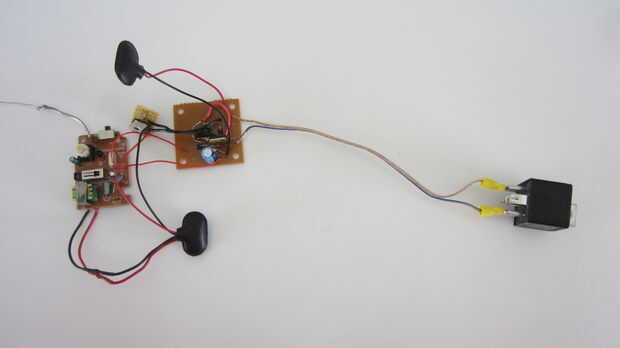 Ahora usted necesita conectar el dispositivo que usted quiere la llave control remoto para control. En este caso era un coche de ruedas de energía. Corté uno de los cables que va desde la batería del coche para el interruptor de encendido. Luego desnudaron el aislamiento de los extremos cortados y doblado en otro conjunto de conectores. Os adjunto uno de estos conectores al terminal común del relé y até el otro conector al terminal del relé "normalmente abierto". Con esta configuración, se desconectará la batería del coche hasta que nuestro circuito activa el relé. De esta forma si el coche va fuera del alcance del control remoto, se apaga automáticamente una vez que deja de recibir la señal desde el transmisor.