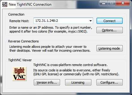 Inicie el visor TightVNC y escriba la dirección IP del Raspberry Pi seguido por un ":" y el número de la pantalla, que puede encontrarse en la ventana del terminal ejecutar xterm-autostart.desktop (normalmente se trata de un 0, pero en nuestro ejemplo pasa a ser un 2).
