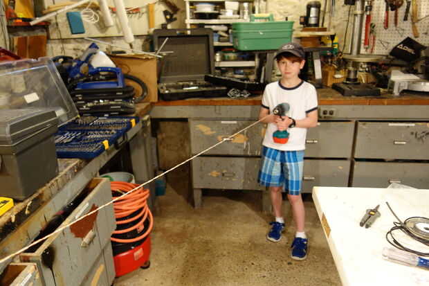 • Ahora, tome un cable individual y añadir a un par.  Usted tendrá 3 cables.  Puso un extremo un en un mandril, sujete el otro extremo a un tornillo de banco o tiene un compañero de mantenerla.  Haga girar el taladro para apretar la vuelta de los alambres juntos.