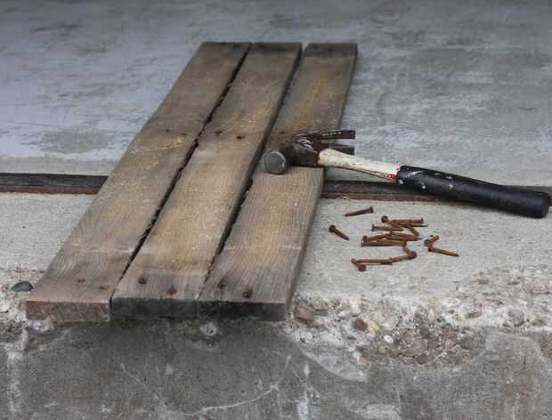 Una vez que tuvimos el material necesario para la Junta de (tres 3" tablones), usa el martillo para clavos hacia fuera de la parte inferior y entonces oró los clavos hacia fuera desde el lado superior. Algunos de los clavos eran inevitablemente oxidadas y dobladas y tomaron un poco de trabajo extra para poder salir.