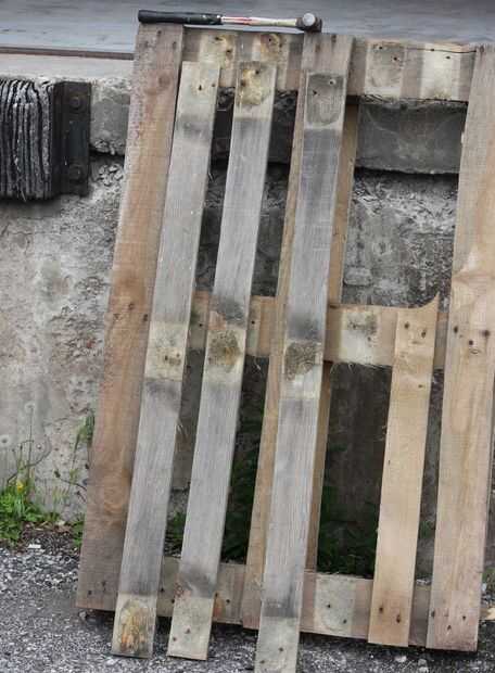 También fueron algunos de los palets usados que fueron puestos junto con grapas. Éstas eran mucho más difíciles de desmontar, pero hemos sido capaces con el mismo martillo y un poco más grasa del codo. Porque las grapas son más difíciles de eliminar completamente, simplemente cortamos los extremos con una tronzadora antes de trabajar con el material.