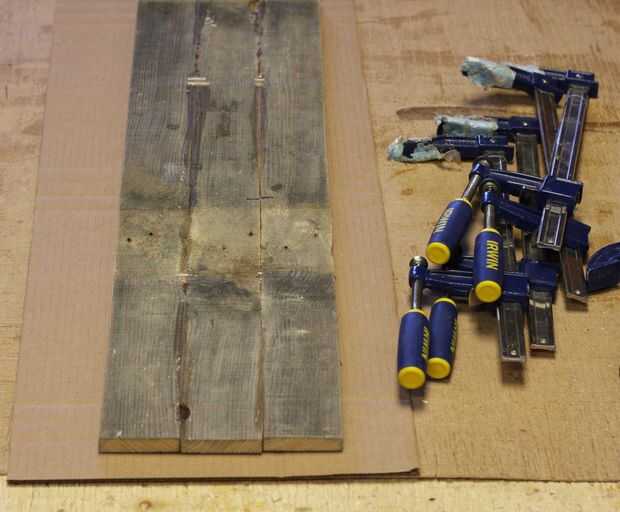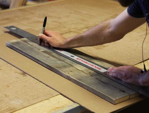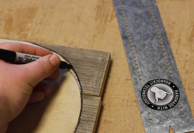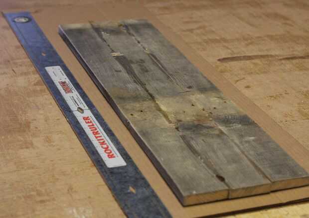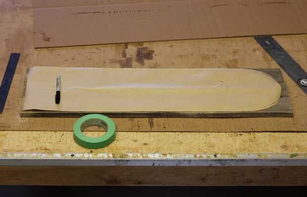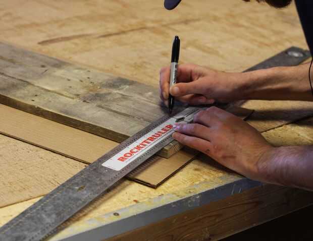 Cuando las juntas termine de secar, nos quitó todas las abrazaderas y comenzamos a disposición nuestra forma final. Para ello, nos primero marcó una línea central en el tablero utilizando la herramienta de alineación del carro RockitRulery utilizan para colocar nuestra plantilla de esbozo de papel simple a la cubierta.