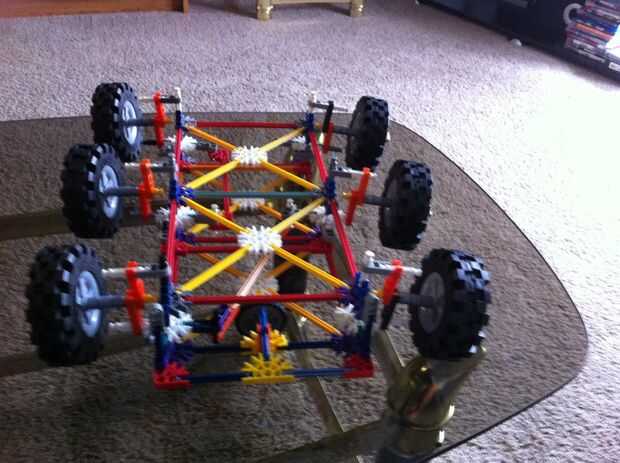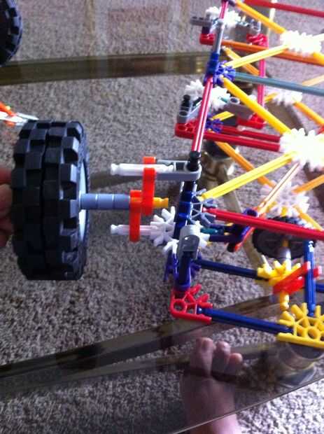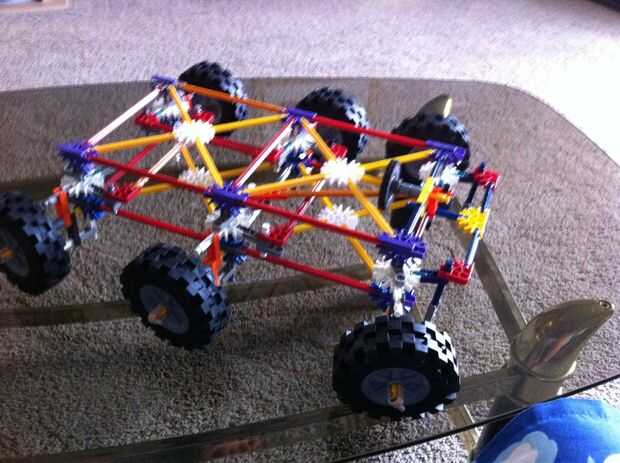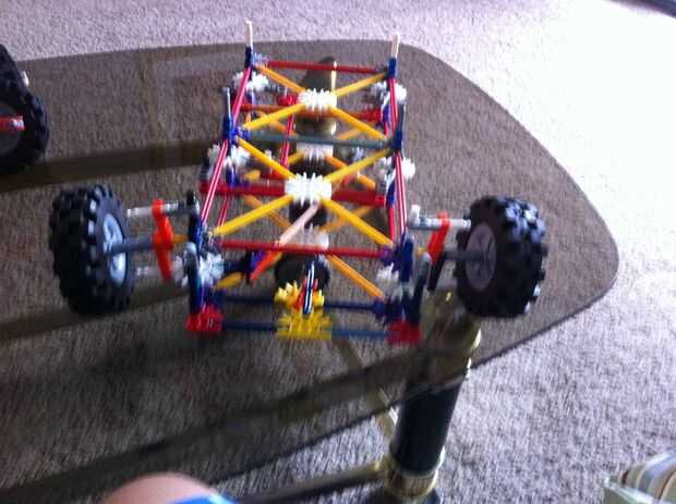 esto es una 4wd K'nex carro con puertas funcionales, un portón, acceso de baterías bajo el capó motor, un volante (dummy), cambio de marchas (dummy), asientos, llanta de repuesto y una cama. El sistema 4wd es rápidamente configurable para la impulsió