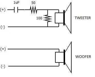 El circuito es un filtro básico y las 2 resistencias bajará la ganancia del tweeter de 3 db. Tenía resistencias de 10 vatios, pero funcionan así resistencias de 1 vatio para un altavoz de 20 vatios. El filtro va en la línea de tweeter, el woofer se conecta directamente al conector de audio.