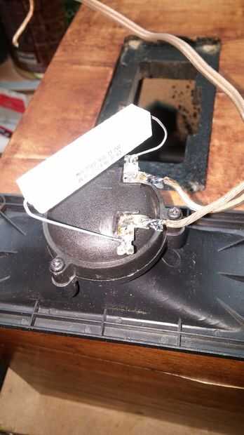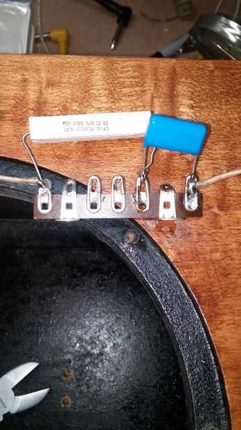 El circuito de la soldadura. Usé una regleta para el conector en serie de condensador y la resistencia de 50 ohmios y el conector del terminal en el tweeter soldar el resistor de 100 ohmios que va en paralelo con él. Esta resistencia protegerá el tweeter de cualquier frecuencia baja no deseados fotos 2 y 3.