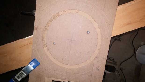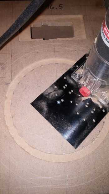 Para la abertura del altavoz para bajas audiofrecuencias usé la fresadora y una plantilla que hice de una pieza de tablero plástico. Hice varios agujeros en el tablero de plástico y sólo "eyeball" los agujeros que me dará el radio que necesitaba. Foto 1