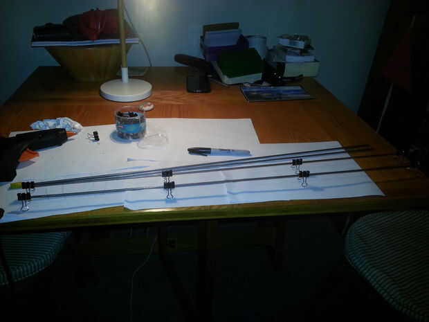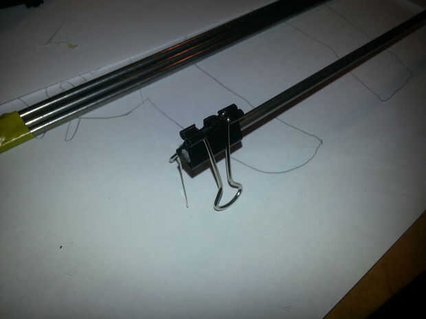 3. Repetir x 3 veces más, igualmente espaciado los clips a lo largo de la varilla y asegura que todos enfrentan la misma manera. Esto puede hacerse fácilmente reclinando los clips en las manijas de metal, si tiene sentido...